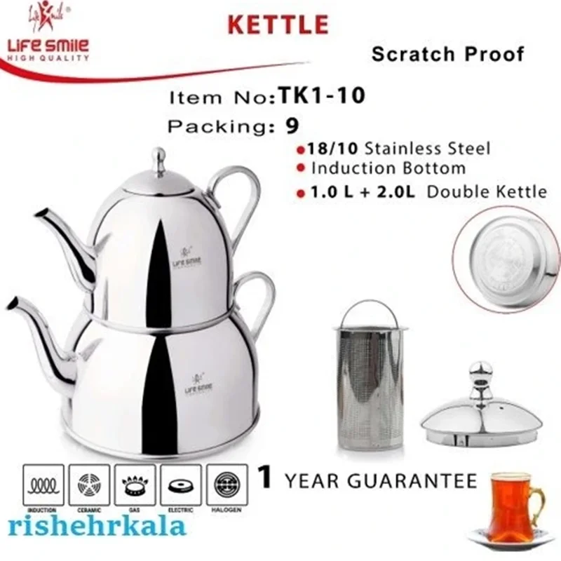 ست کتری و قوری لایف اسمایل مدل TK 1-10 از جنس استیل ضد زنگ و با کیفیت ساخت بسیار بالا است . استیل این محصول از نوع ضد خش بوده و در برابر تغییر رنگ بسیار مقاوم است . همچنین یک فیلتر استیل همراه این محصول است تا در زمان دم آوری چای و دمنوش به شما کمک کند.