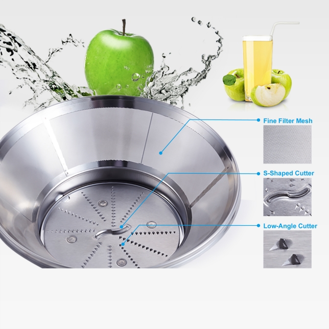 تیغهی برندهی Sشکل آبمیوهگیری MJ-DJ31 از جنس تمامفلزی ساخته شده است و میتواند میوهها را با قدرت در جای خود ثابت نگه دارد تا عصارهی میوه گرفته شود. با چرخش سریع این تیغه، تفالهی میوه با نیروی گریز از مرکز از عصاره آن جدا میشود و به مخزن تفالهگیر 2لیتری آبمیوهگیری منتقل میشود.