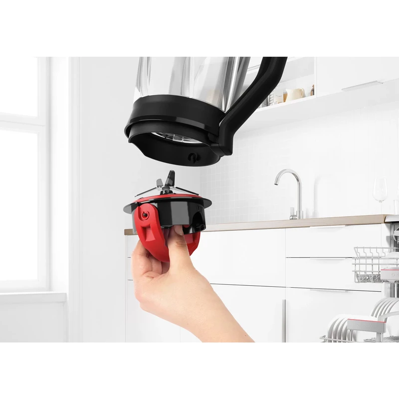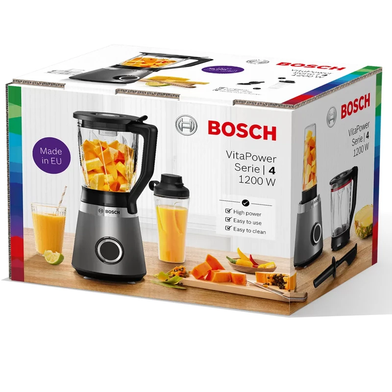 مخلوط کن و اسموتی ساز فوق پیشرفته و حرفه ای مدل MMB6174S یکی از محصولات جدید و با کیفیت کمپانی آلمانی بوش می باشد.این محصول با بهره مندی از موتور پرقدرت 1200وات با دور موتور 30000 دور در دقیقه می تواند تمام نیازهای شما را برطرف کند.اگر شما از آن دسته کسانی هستید که می خواهید در محیط کار یا هنگام رفتن به بیرون و باشگاه نوشیدنی های طبیعی میل کنید ، خرید این دستگاه برای شما ضروری می باشد . چون همراه این محصول یک بطری 0.6 لیتر عرضه شده است که شما بعد از درست کردن اسموتی می توانید نوشیدنی های خود را داخل این بطری قرار دهید و با خود حمل کنید همچنین درب این بطری کاملاً وکیوم می باشد.
